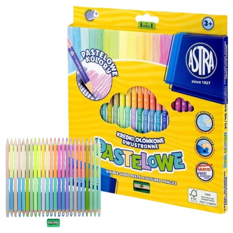 Astra Трикутні Двосторонні Пастельні Олівці Шкільні 24 Шт. 48 Кольорів + Точилка