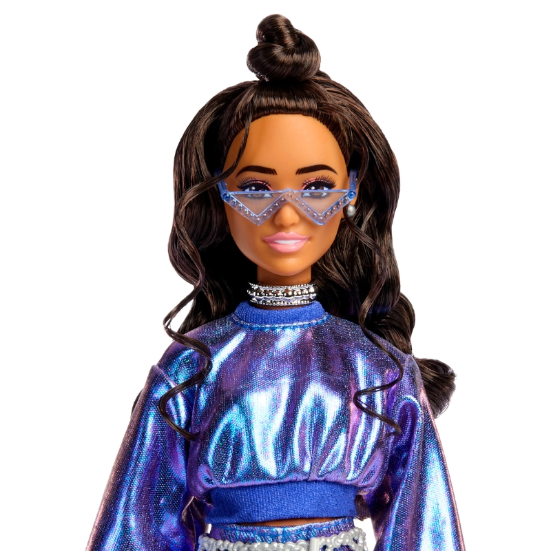 Весь образ доповнюють блакитні окуляри, "кристалева" сумочка та срібні черевики, створюючи ідеальний вигляд для прихильниць моди. Це лялька, яка надихає, розвиває уяву та заохочує до створення власних стильних історій.