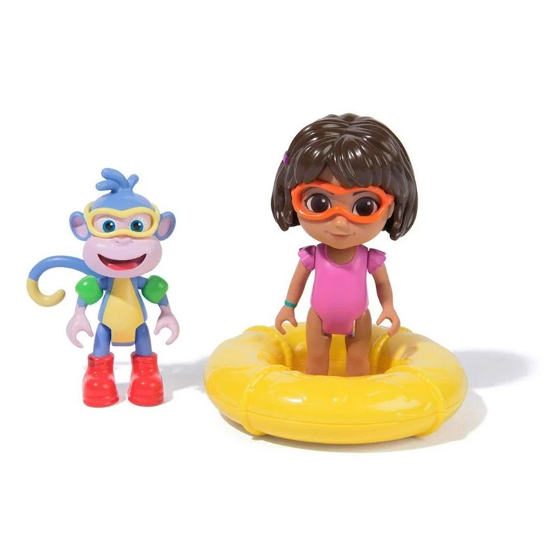 Дора у рожевому купальнику та оранжевих ластах готова до занурення, а її найкращий друг Бутек – у зелених рукавчиках і червоних черевиках – завжди готовий супроводжувати її у розвагах.
