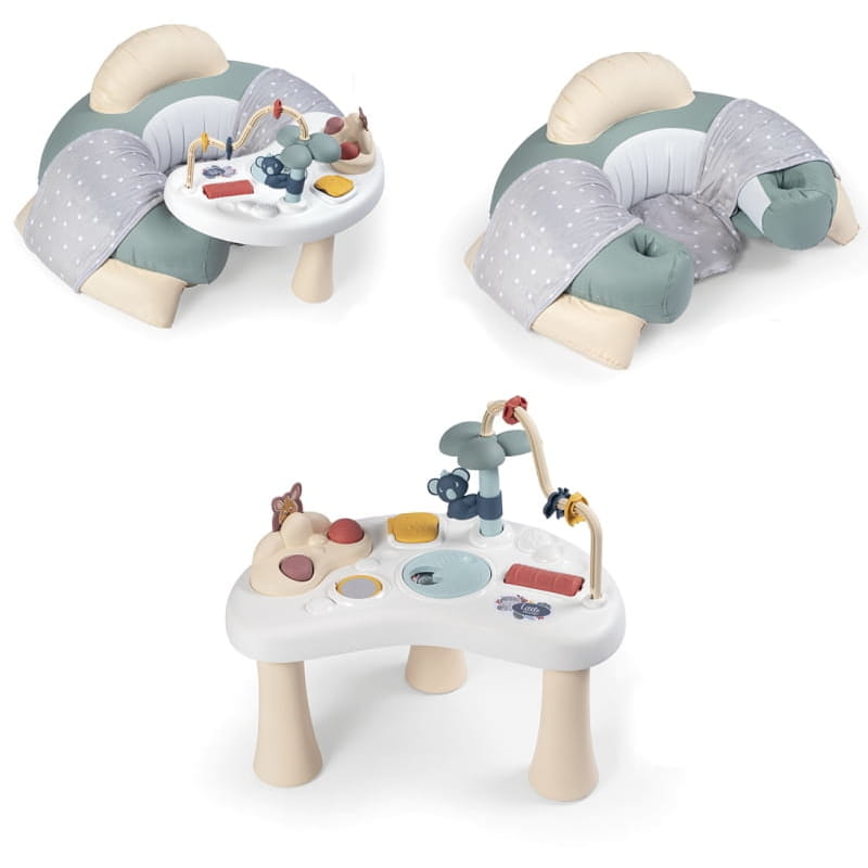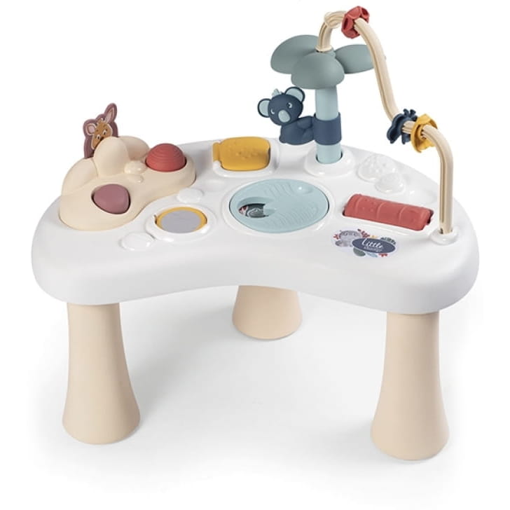 Інтерактивний столик відчеплюється, стоїть на 3 ніжках та має безліч різноманітних функцій і форм гри. Різноманітні іграшки, такі як: ховаючий кенгуренок, крутячий коала, рухомі бісеринки, приховані елементи або дзеркальце, стимулюють органи чуття та розвиток дітей.
