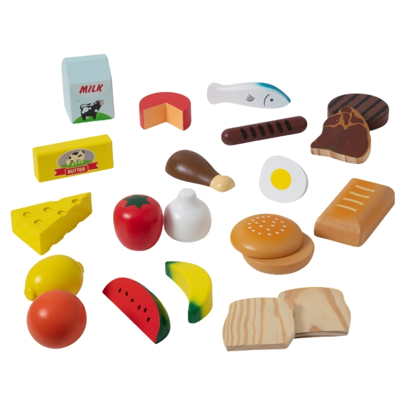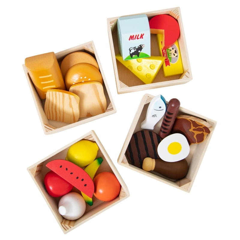 У комплект входять чудово виготовлені продукти харчування з масивного дерева – соковиті фрукти, хрусткі овочі, молочні продукти, м’ясо, риба та продукти з злаків. Кожна група харчування має власну дерев’яну коробочку, завдяки якій дитина вчиться порядку та самостійності.