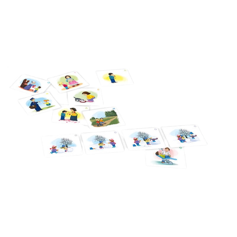 Гра була створена з думкою про дітей від 3 років, і відмінно підійде як у домашньому затишку, так і в дитячих садках чи під час сімейних моментів, сповнених близькості. Досить розкласти ілюстрації, дати волю фантазії та дозволити, щоб з дитячих уст знову полинули слова: „Мамо, послухай, що сталося…”