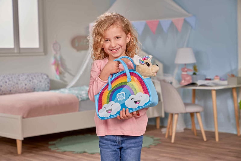 Представляємо плюшевого песика чихуахуа, якого ти можеш носити з собою куди завгодно, завдяки веселковій, бліскучій сумці. Сумка синя і прикрашена бліскучим веселкою, на кінцях якої знаходяться усміхнені хмаринки.