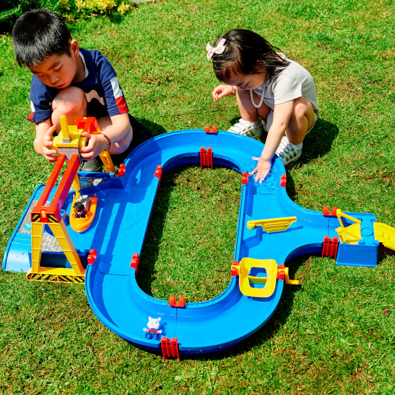 Обертання ручки дозволяє дітям визначати напрямок і швидкість потоку води в каналах. Водна траса розмірами 104 x 90 x 25 см є ідеальним рішенням для ігор також вдома.