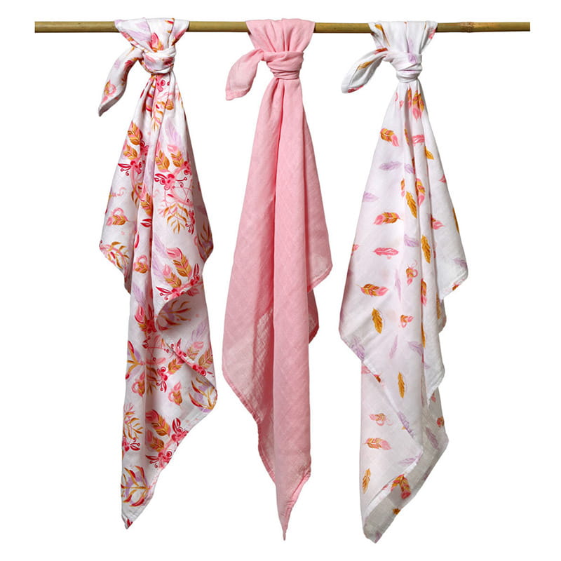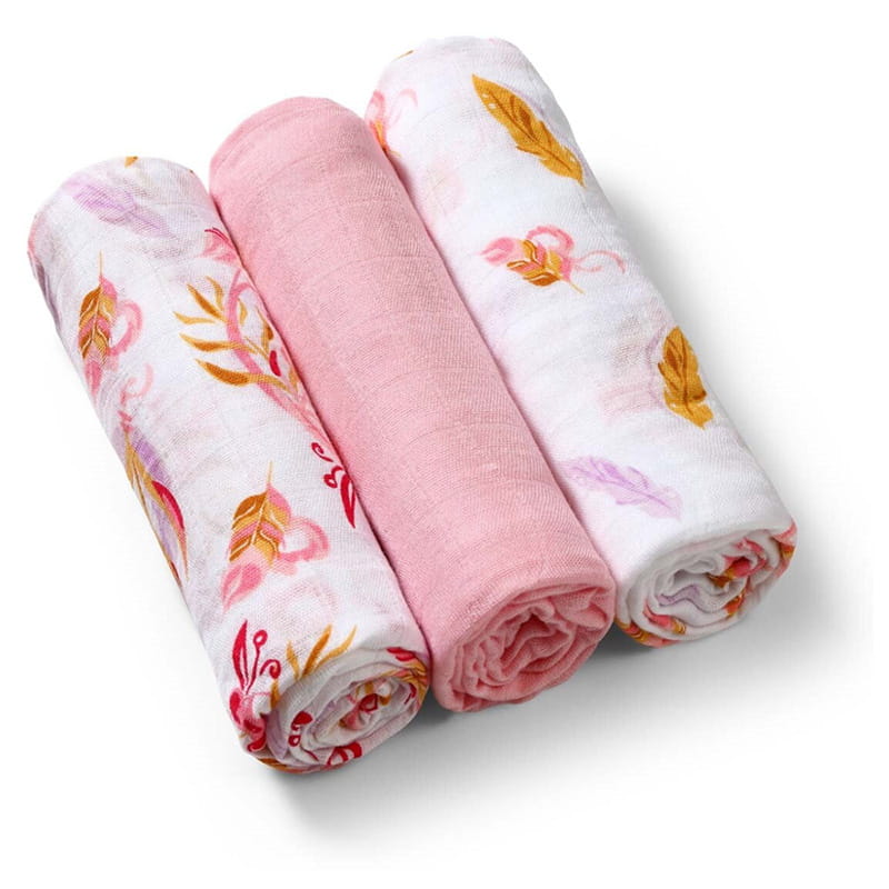 Zestaw zawiera 3 szt. pieluszek: 2 szt. wzorzyste, 1 szt. w jednolitym kolorze różowym.