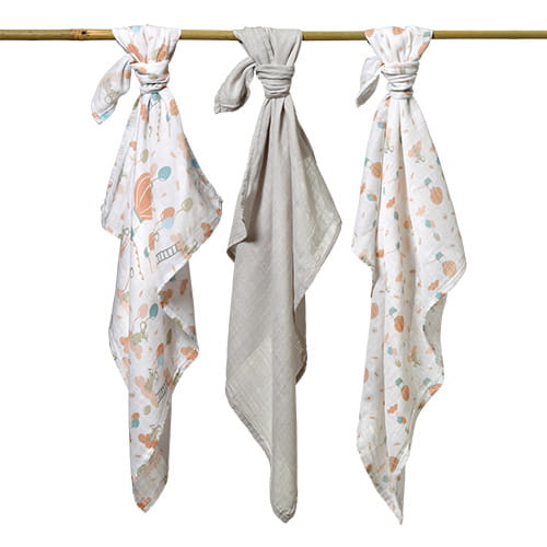 Zestaw zawiera 3 szt. pieluszek: 2 szt. wzorzyste, 1 szt. w jednolitym kolorze szarym.