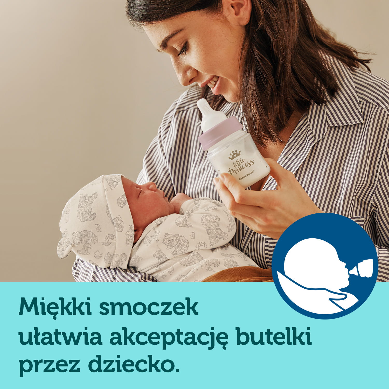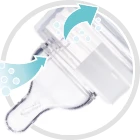 Бутилка має ніжну, високоякісну силіконову соску 0+, що нагадує формою сосок. Соска оснащена антоколковим клапаном, який запобігає появі бульбашок повітря в їжі, зменшуючи ризик кольок, болю в животі та скупчення газів. Все це для щасливого животика вашого малюка!
