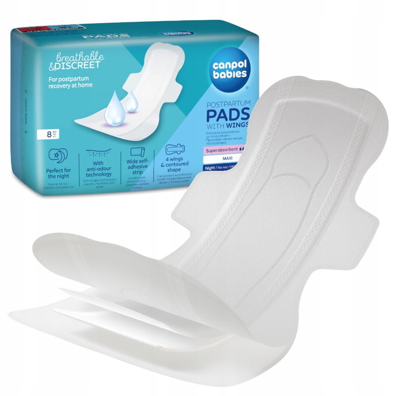 Подовжений розмір підкладки (42 см) було адаптовано, щоб добре захищати від протікань, також у лежачому положенні. Підкладки після народження Canpol babies мають лише 2,2 мм товщини, але забезпечують до 100% захисту від протікань і дискретність носіння.