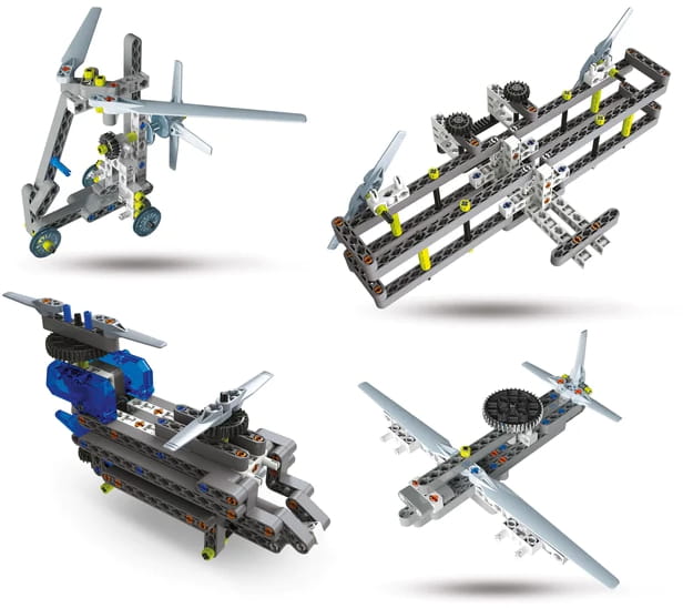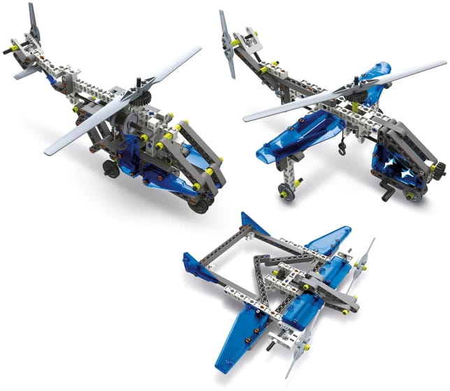 Самолети і гелікоптери — це навчальний набір для всієї родини, який дозволить вам ознайомитися з аеродинамікою і авіацією. За допомогою безкоштовного додатку Наукова Ігра Build ви зможете створити аж 10 різних моделей повітряних транспортних засобів.