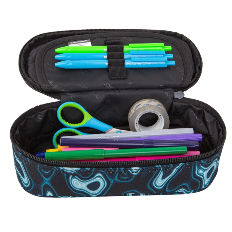Piórnik w kształcie owalu jest jednokomorowy i na wieczku posiada specjalną klapkę z przegródkami, w której możesz umieścić najpotrzebniejsze przybory szkolne takie jak pióro czy ołówek.