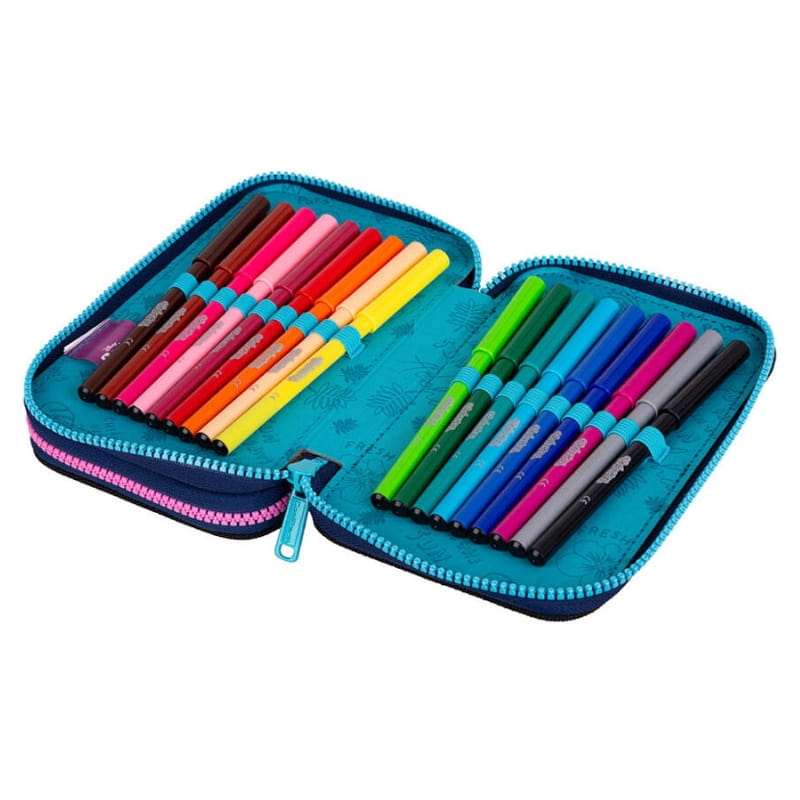 Każda przegródka piórnika zamykana jest na solidny zamek. Boki piórnika są twarde, dzięki czemu jest długotrwały, a jego zawartość jest bezpieczna.