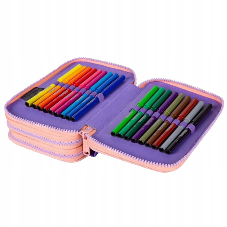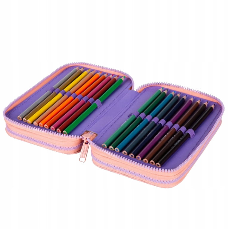 Пенал виконаний у приємній для ока кольоровій гамі в градієнтному візерунку, що поєднує персиковий та фіолетовий кольори.