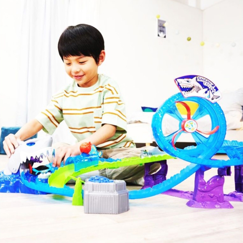 Ця унікальна автомобільна траса для дітей підносить розваги на абсолютно новий рівень – тут важливі рефлекси, відвага і швидка реакція. Траса проходить прямо через величезну пащу акули, яка тільки чекає, щоб захопити мчущий автомобільчик! Але обережно – іноді акула має хороший настрій і випускає автомобіль назад на трасу, розпочинаючи новий раунд, повний сміху та адреналіну.