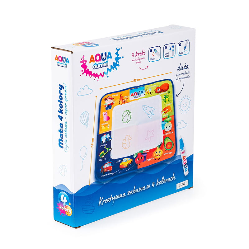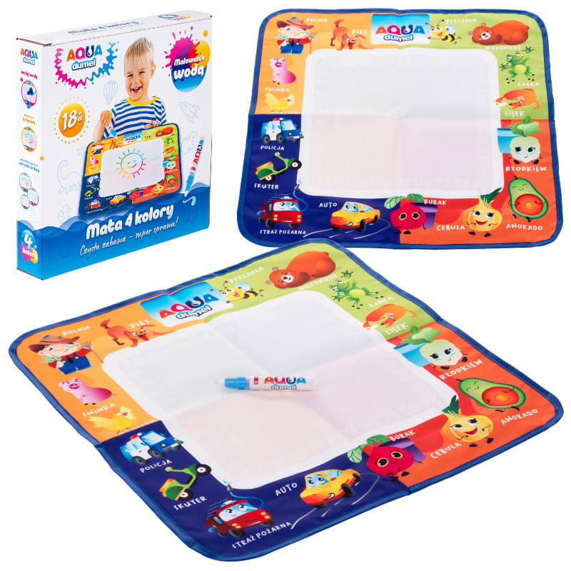 Відкрийте творчий потенціал і розвивайте художній талант вашої дитини завдяки нашій унікальній маті для малювання! Ця мата, поділена на чотири кольорові зони, надає вашій дитині можливість створювати кольорові малюнки в захоплюючий спосіб. Додатково, край мату прикрашений радісними малюнками та їх назвами, що не тільки додає чарівності, але й допомагає дітям вивчати нові слова. У наборі ви знайдете спеціальний маркер, який, після заповнення водою, дозволяє вашому малюкові малювати на маті.