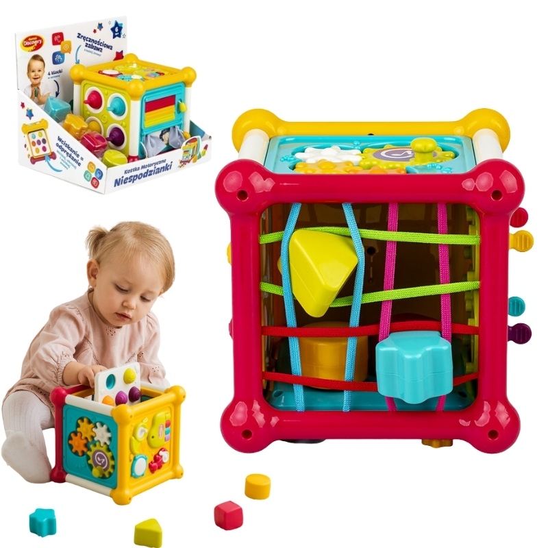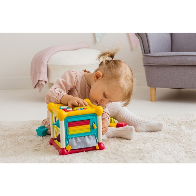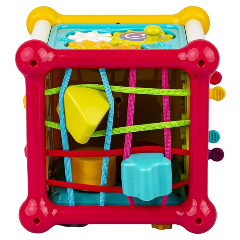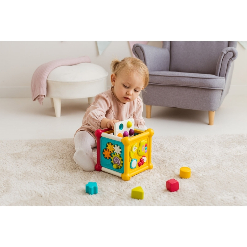 Цей кольоровий кубик – це справжній центр інтерактивного розваги, який має на меті розважити багатьма різними способами, надаючи вашому малюку безліч можливостей для вправляння ручок! Кожна зі стінок пропонує іншу сенсорну активність. Ви знайдете тут захоплюючі шпильки для обертання, жалюзі для відкриття та завісочки для розсування, які залучають та інтригують маленькі пальчики.