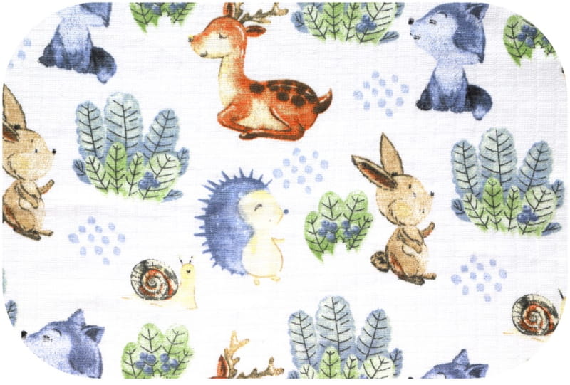 Набір містить 5 бавовняних пелюшок, з яких 2 однотонні (темно-синя та зелена), а 3 мають надруковані малюнки тварин.