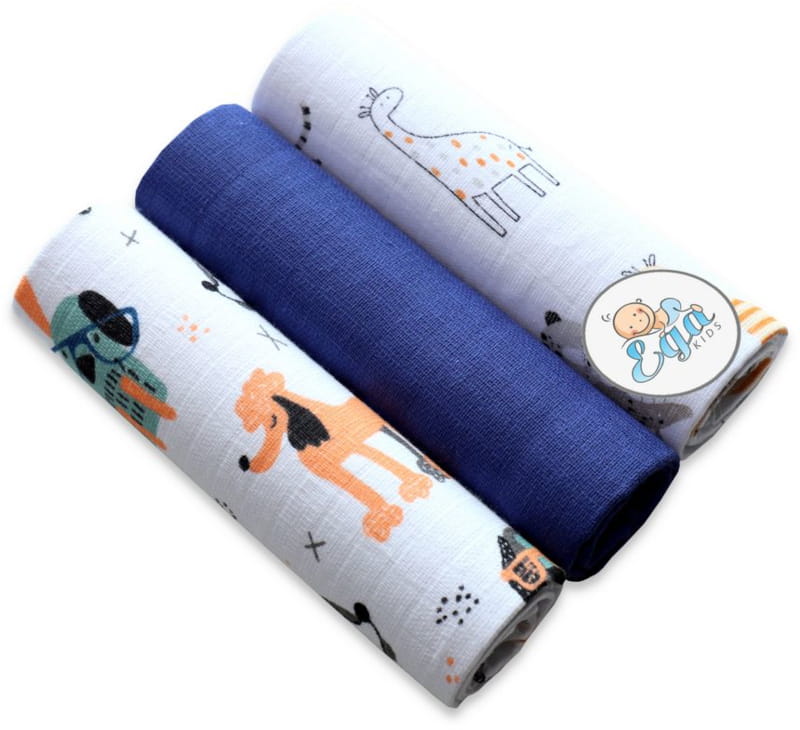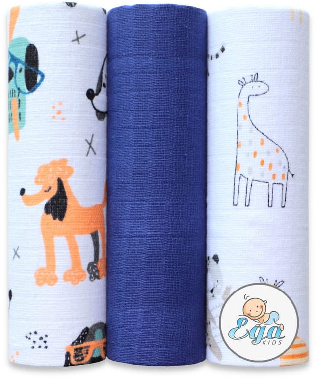 Набір містить 3 тетронових пелюшки, з яких 1 є синьою без візерунків, а 2 мають надруковані малюнки тварин. Пелюшки виконані на 100% з бавовни найвищої якості з граматурою 120г/м2 та мають сертифікат OekoTex.