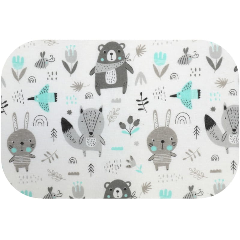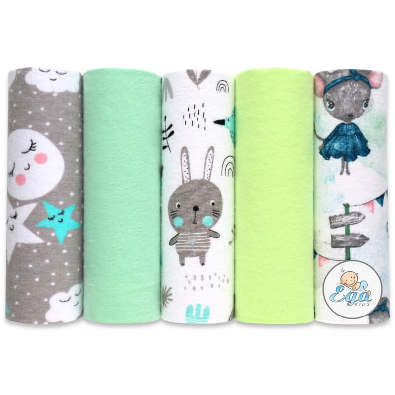 Комплект містить 5 шт. фланелевих пелюшок, серед яких дві однотонні в відтінках зеленого та 3 з милими принтами: