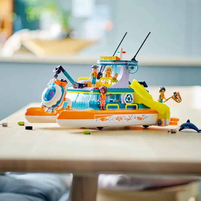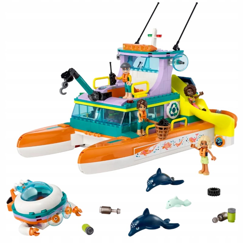 Морський рятувальний човен з набором милих аксесуарів перенесе дитину у світ LEGO Friends. Діти мають неймовірну можливість відкривати різноманітні активності, такі як збір сміття з океану, його сортування для переробки та перевірка якості води. Збирайте сміття за допомогою палки, плавайте в рятувальному жилеті або виловлюйте сміття за допомогою гака або підводного човна.