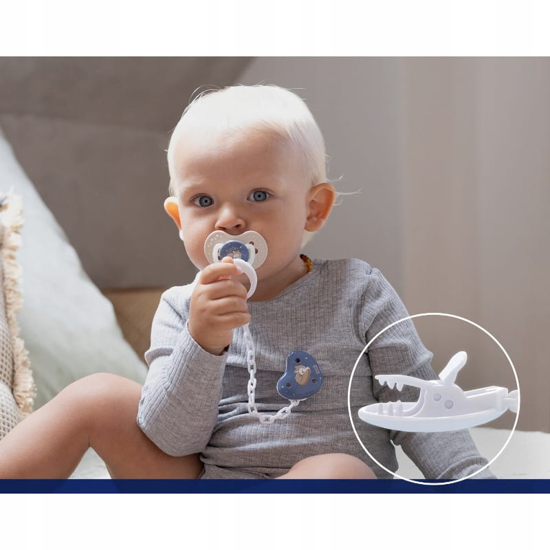 Ланцюжок LOVI обладнаний практичним кліпсом, який дозволяє надійно і міцно закріпити його на одязі дитини, захищаючи смечку від забруднення чи втрати.