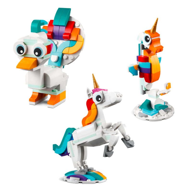 Те, що вирізняє серію Creator, це можливість перебудувати моделі двома іншими способами з тих самих цеглинок. Єдинорога можна перетворити також в морського коня на основі, що імітує дно морське, або перетворити його в рухомого магічного павича з кольоровим хвостом.