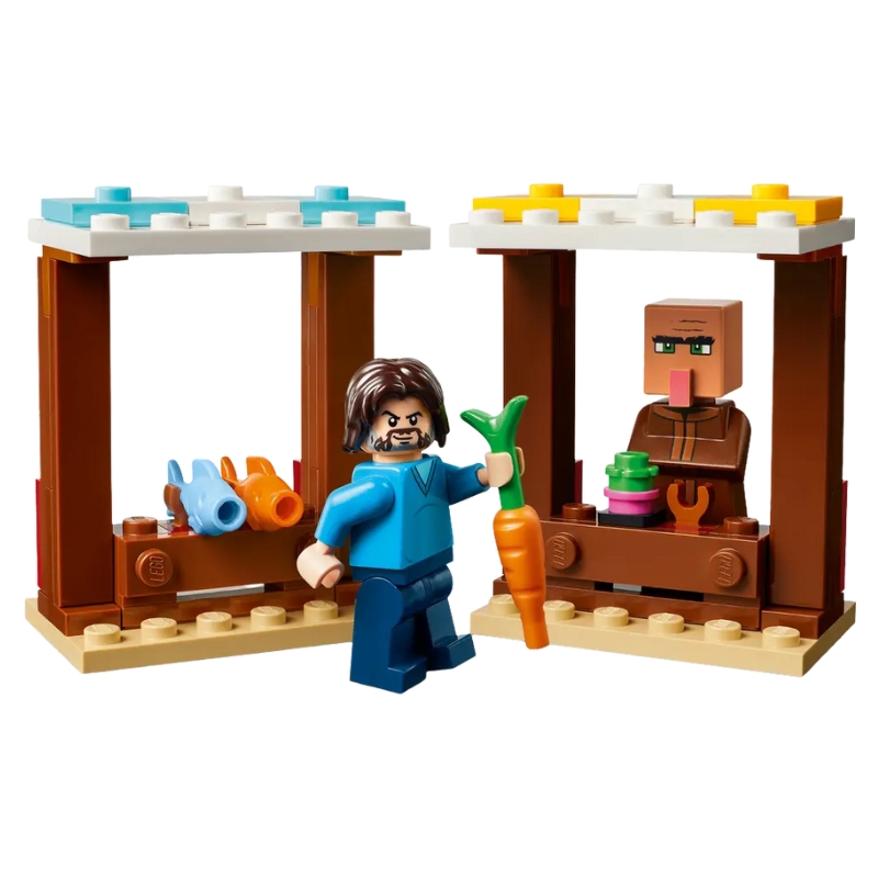 Сцену прикрашають кольорові скрині, жвавий фонтан з функцією вибуху та милий, гігантський курча на даху ресторації, який може відкласти яйце, як у грі. Кожен елемент набору був спроектований так, щоб передати атмосферу справжньої місії Minecraft, повної дій, кмітливості та сміливості.