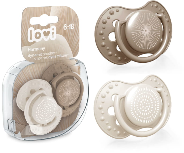 Соски Lovi Harmony Girl виконані в нейтральній, мінімалістичній кольоровій гаммі. Одна соска є коричневою, друга бежевою. Кожна з сосок має делікатний, світлий малюнок. Соски звертають увагу не лише на ідей мінімалізму, але й на близькість до природи та заспокоєння.