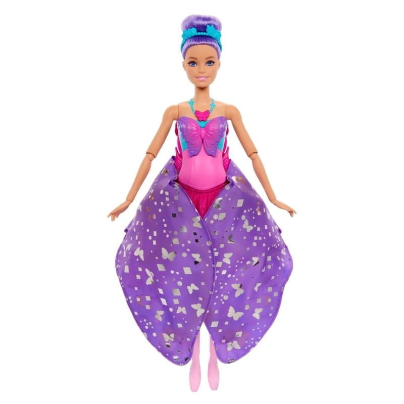 Wystarczy nacisnąć magiczny naszyjnik Barbie, aby jej delikatna fioletowa spódniczka przemieniła się w zachwycające, rozłożyste skrzydła motyla. Ten baśniowy moment można odtwarzać bez końca, zapewniając dzieciom godziny magicznej rozrywki.