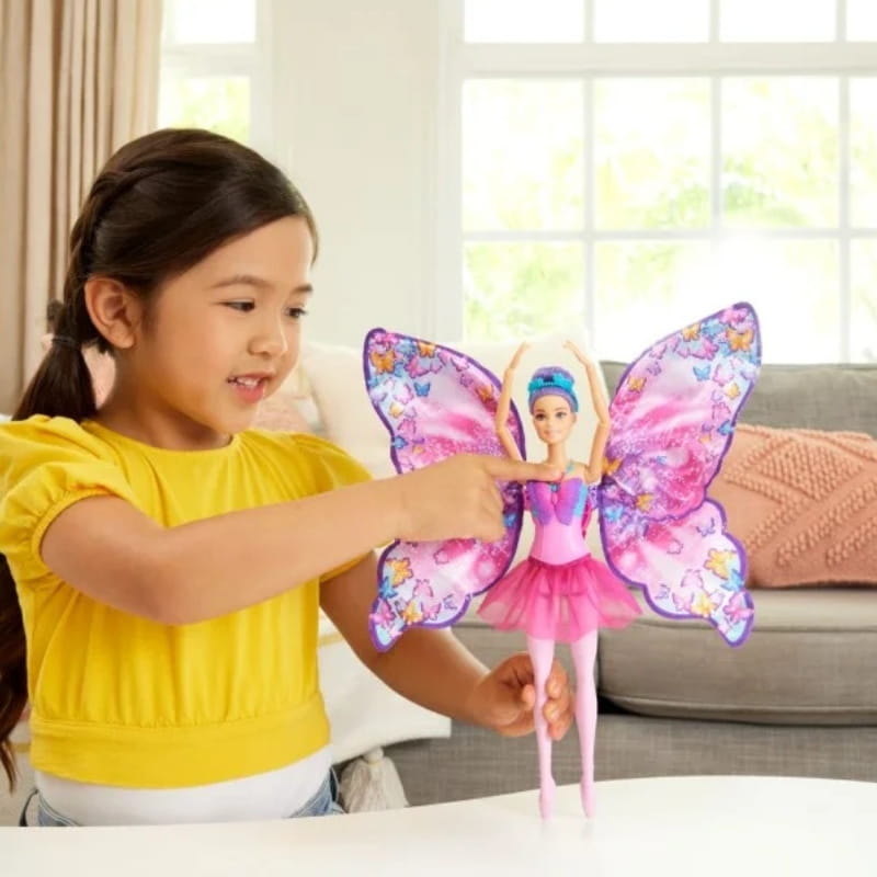 Wspaniałą funkcję transformacji dopełnia starannie zaprojektowany strój – różowy gorset inspirowany motylami, tutu w intensywnym różu i klasyczne baletki, które dodają lalce elegancji baleriny. Skrzydła Barbie można łatwo złożyć i rozłożyć ponownie, co umożliwia niekończącą się zabawę w przemiany.