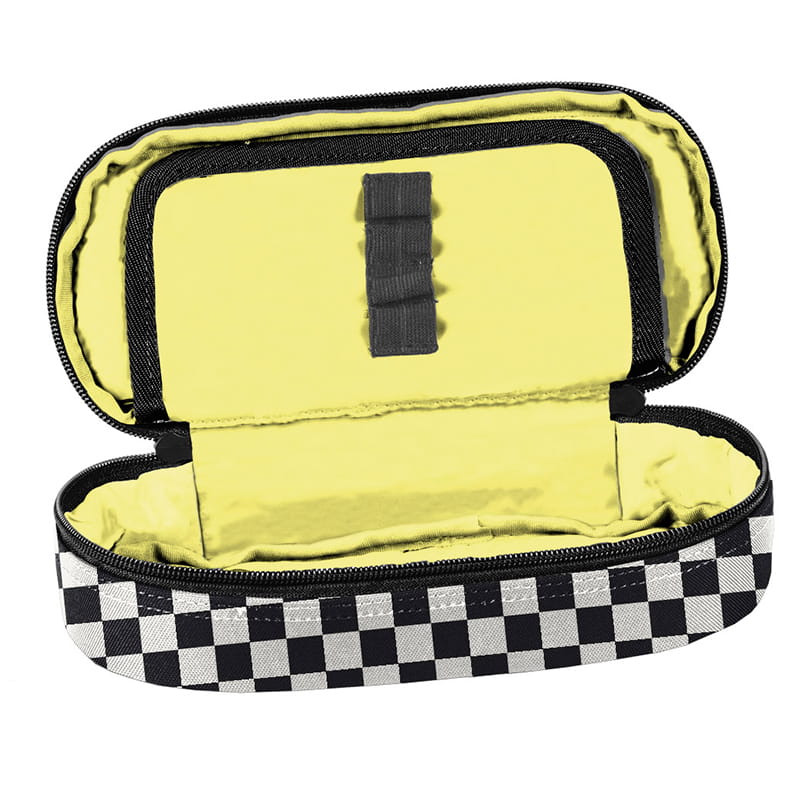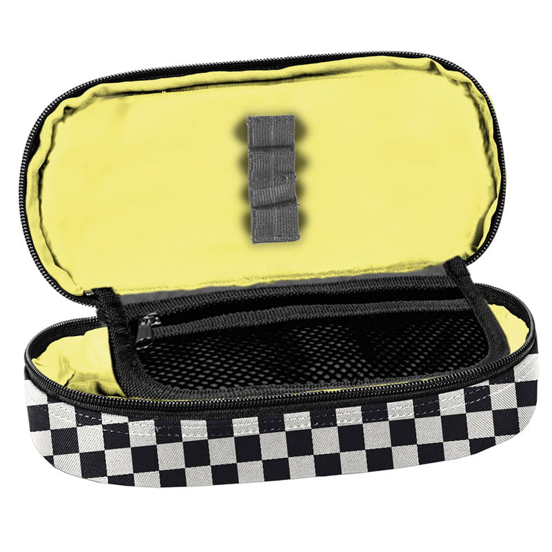 Пенал має клапан, з одного боку якого є сітчастий кишеня на замку, а з іншого – перегородки для найбільш часто вживаних приладів, таких як ручка або олівець.