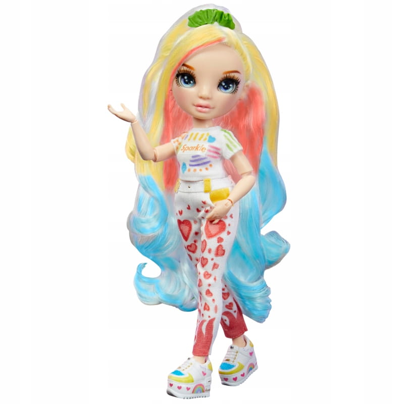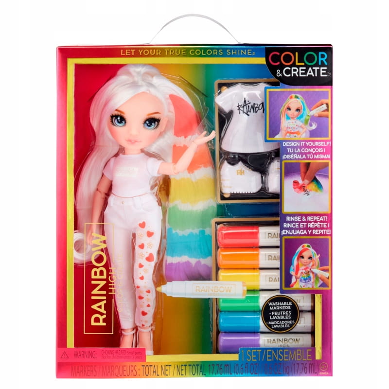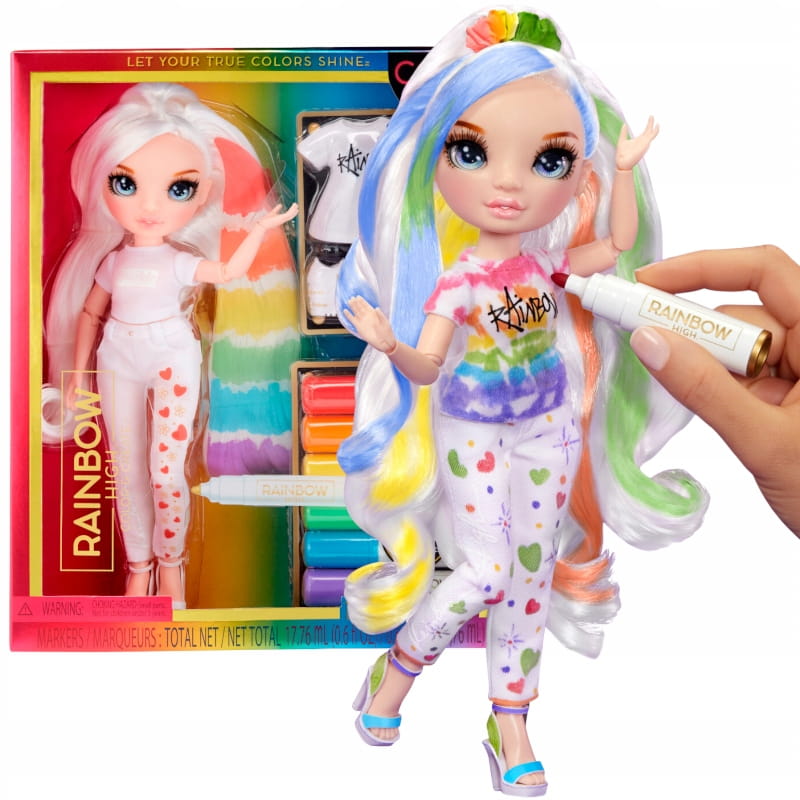 Лялька має ніжне, біле волосся та одягнена в білий костюм. Ти можеш використовувати змивні маркери класичних кольорів райдуги, щоб створити її одяг за власним баченням. Ця повністю рухома лялька має рухомі суглоби, що дозволяють встановлювати її руки та ноги в різноманітні, ефектні пози.
