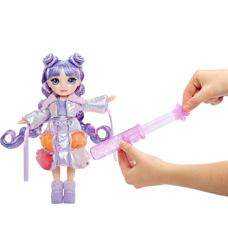 Violet jest ubrana w wyjątkową, ciepłą kurtkę z „magicznego śniegu”, która nadaje całej stylizacji niepowtarzalnego zimowego klimatu. Wystarczy kilka kropli wody, by kurtka nabrała puszystości i intensywnych, nowych odcieni – to prawdziwa modowa magia, która z pewnością zachwyci każdego fana Rainbow High!