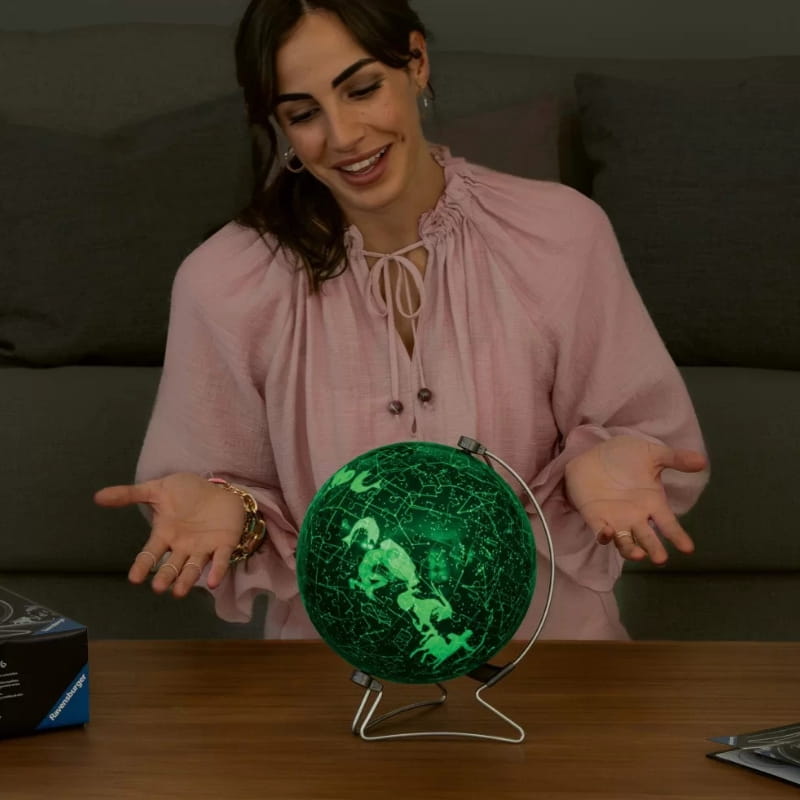 Puzzle 3D Ravensburger Globus Świecący w Ciemności to wyjątkowy model, który zachwyci zarówno dzieci, jak i dorosłych. Każdy element tej trójwymiarowej kuli został zaprojektowany z precyzją, a widoczne na niej konstelacje gwiazd i znaki zodiaku zaczynają magicznie świecić po zgaszeniu światła, tworząc niezwykły efekt nocnego nieba.