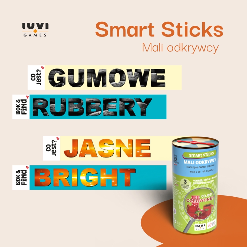 У наборі є 52 таблички з прикметниками – кожна з них допомагає дитині краще зрозуміти світ і описувати його своїми словами. Прості правила та три варіанти гри роблять так, що навіть малюки без зусиль можуть приєднатися до забави. Більше того, всі картки є двомовними – польською та англійською – що означає, що дитина з наймолодших років звикає до другої мови у зовсім безстресовий спосіб. Завдання базуються на асоціаціях, спостереженнях і трішки уяві: спробуйте знайти щось, що м'яке, синє і легке! Раптом світ набуває нових значень!