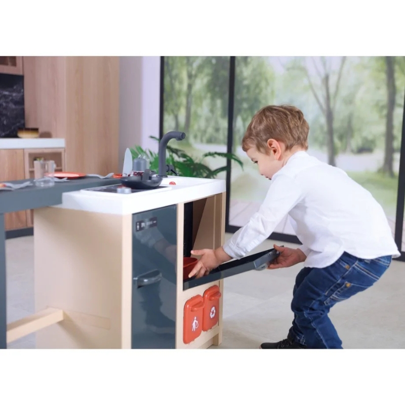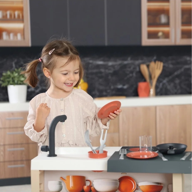 У комплекті є плита з поворотним ручкою, духова шафа, холодильник і раковина, завдяки яким діти можуть відчути себе як у справжній кухні.