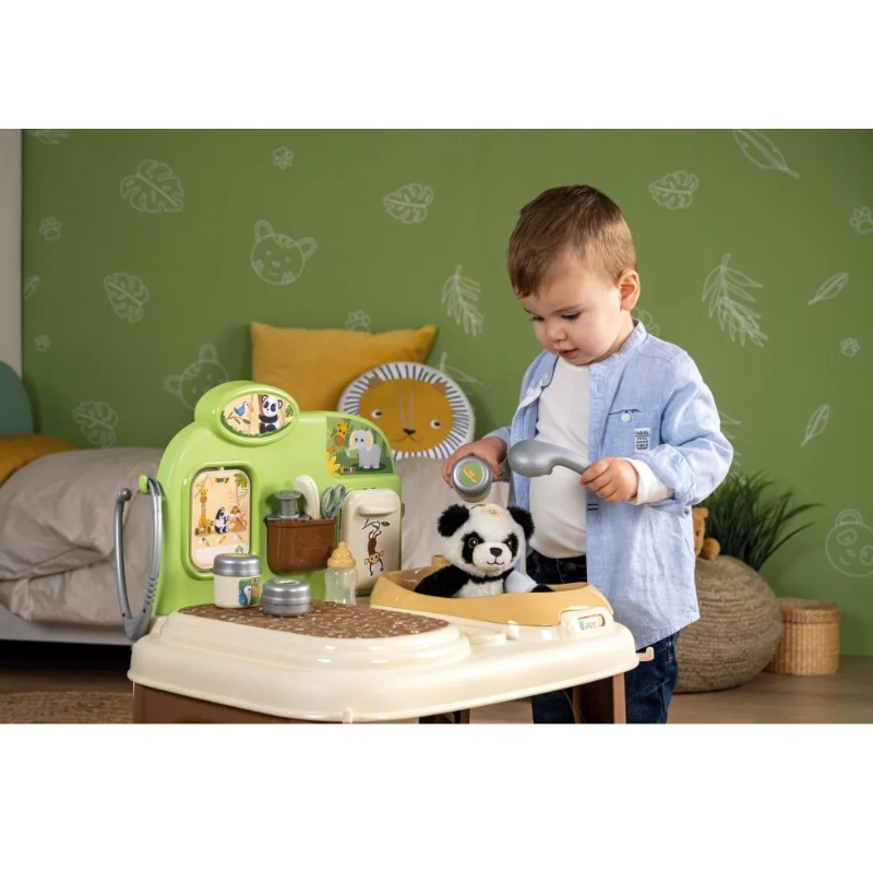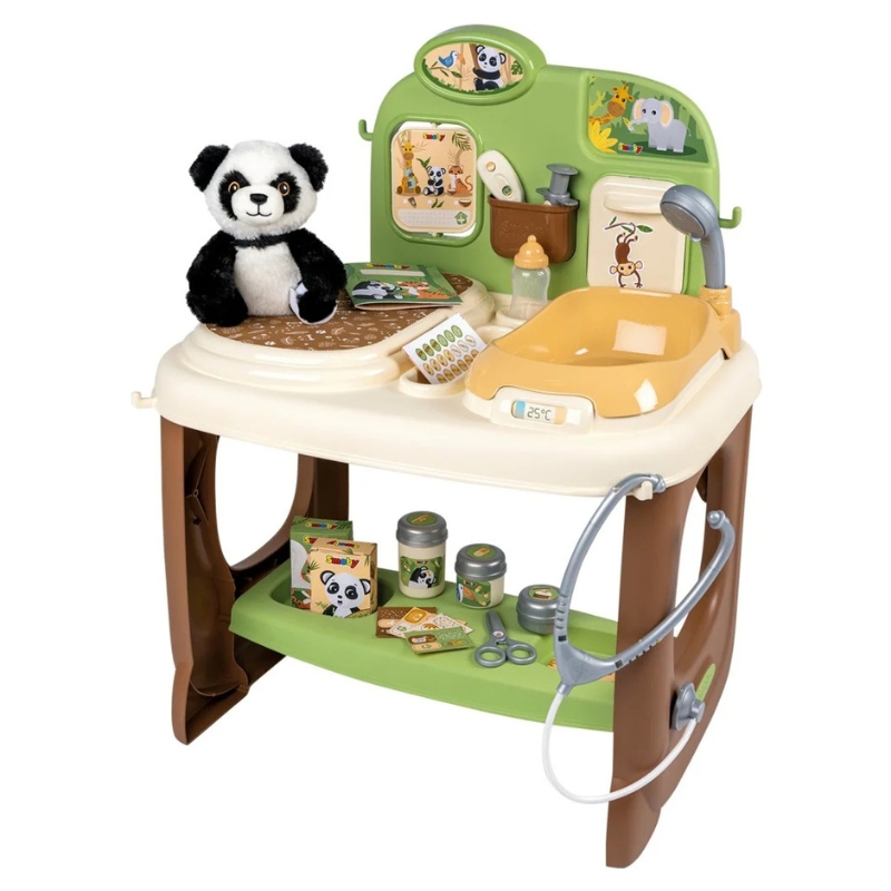Центр спроектовано так, щоб нагадувати справжній ветеринарний кабінет. На столі для досліджень малюк може оглянути свою панду, виміряти її температуру, слухати пульс стетоскопом, робити уколи, а коли прийде час на купання — скористатися ванночкою з душем.