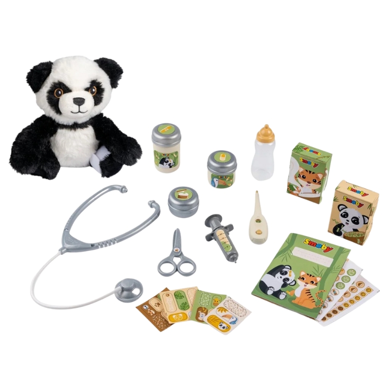 У наборі є миленька плюшева панда, а також комплект інструментів і аксесуарів: термометр, стетоскоп, шприц, пляшка з соскою, книжечка лікування, контейнери для ліків, коробки з їжею, ножиці і багато іншого.