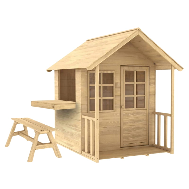 Природне дерево і старанне виконання роблять, що набір ідеально вписується в будь-який зелений простір, створюючи затишне місце, де діти почуваються як у своєму власному, чарівному куточку.