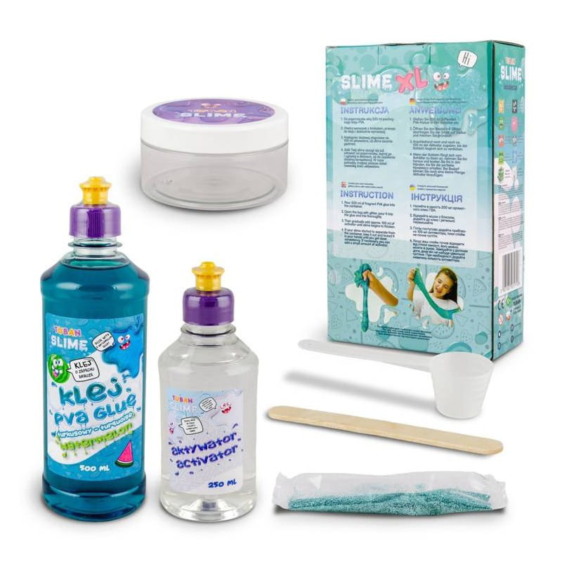 З набором Watermelon Slime XL діти відкриють магію створення - з'єднають інгредієнти та побачать, як бірюзовий клей з запахом арбуза, збагачений блискітками та активатором, перетворюється на блискучу, еластичну масу.